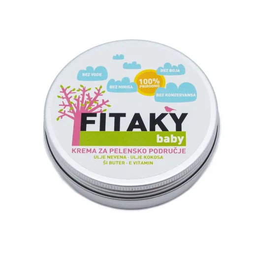 Fitaky baby krema za pelensko područje je bezmirisna 100% prirodna krema bez sintetičkih sastojaka za zaštitu i negu pelenske regije, tela i lica beba koja ne sadrži vodu.