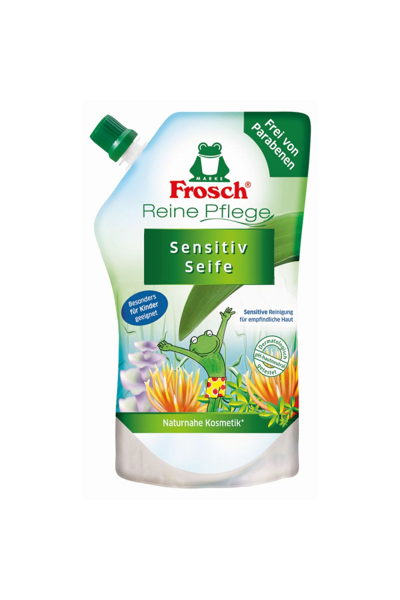 Frosch dečiji tečni sapun refil 500ml je jedinstveni proizvod sa osetljivom formulom koji čisti i štiti osetljivu dečiju kožu. Štiti od isušivanja prilikom svakog pranja. Vredna svojstva i hranljivi aktivni sastojci održavaju prirodnu vlagu u koži. Formula ne sadrži parabene i boje, pH neutralna je i dermatološki testirana.